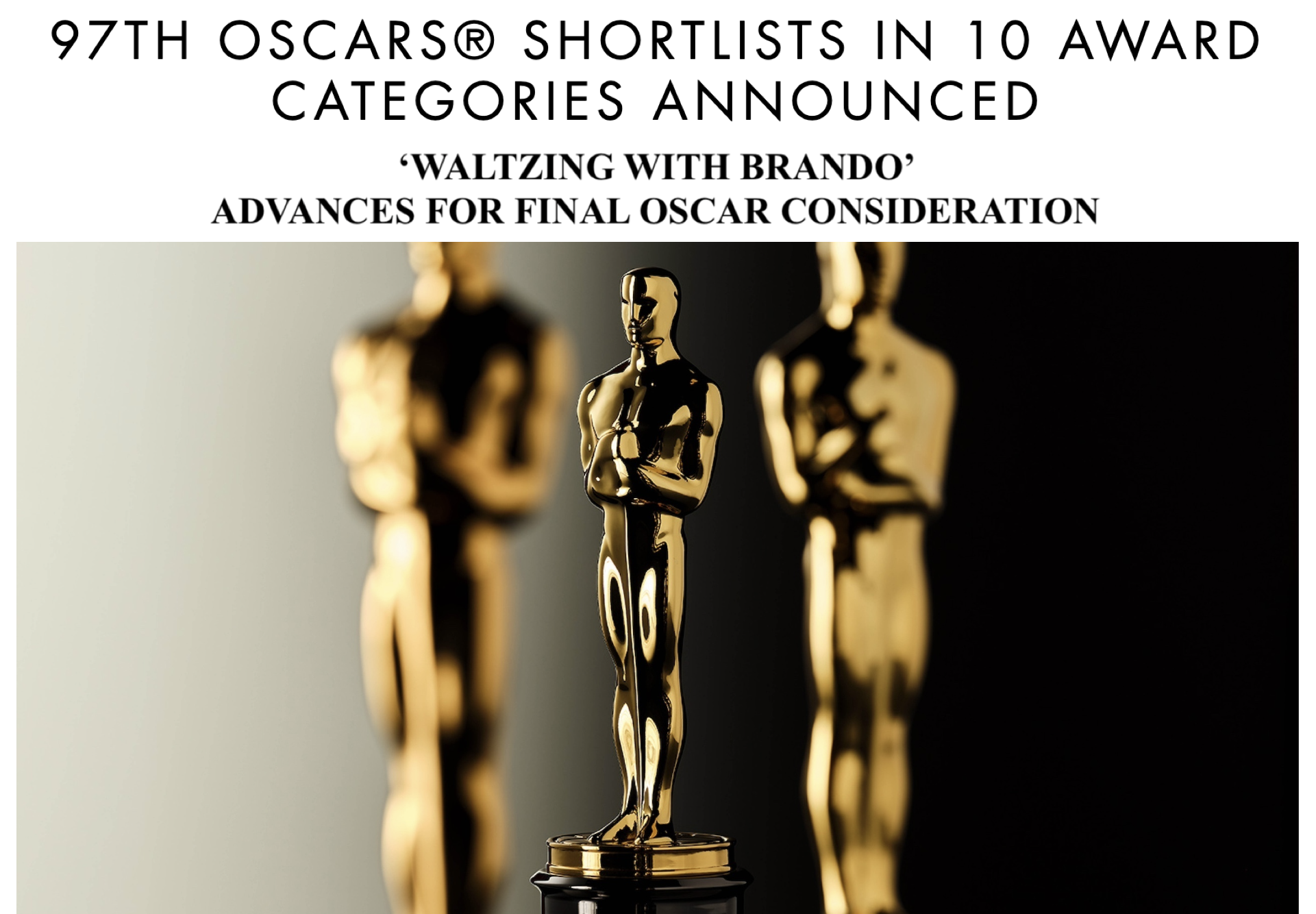 OSCARS SHORTLISTS ANNOUNCED: “Waltzing with Brando” advances in the Makeup and Hairstyling category for the 97th Academy Awards.